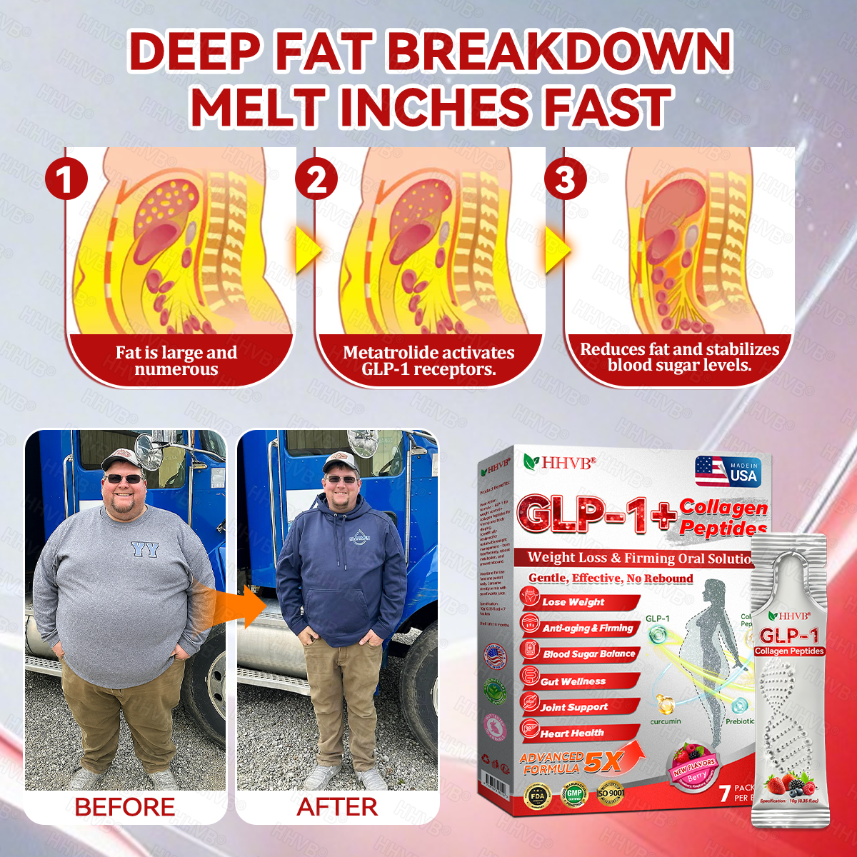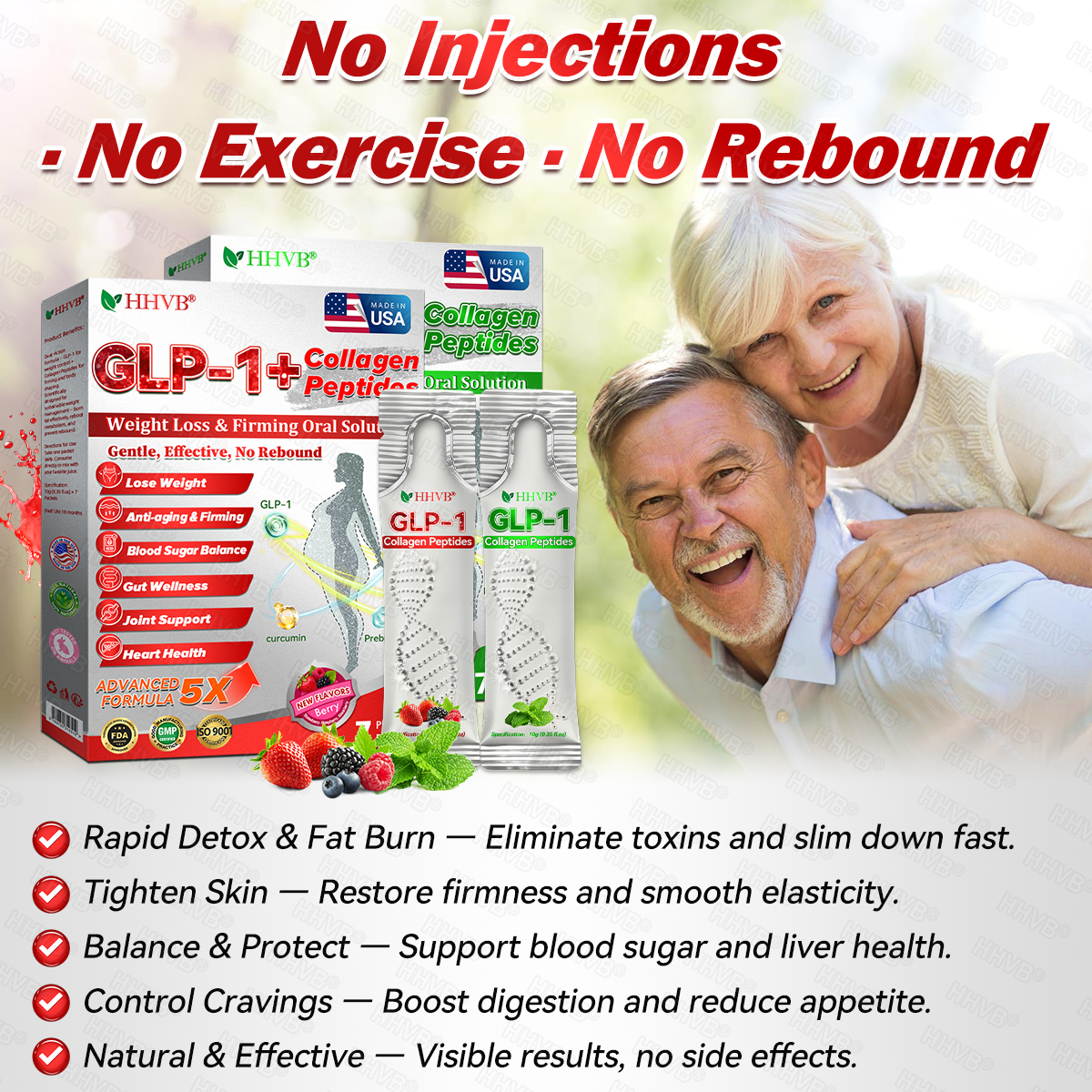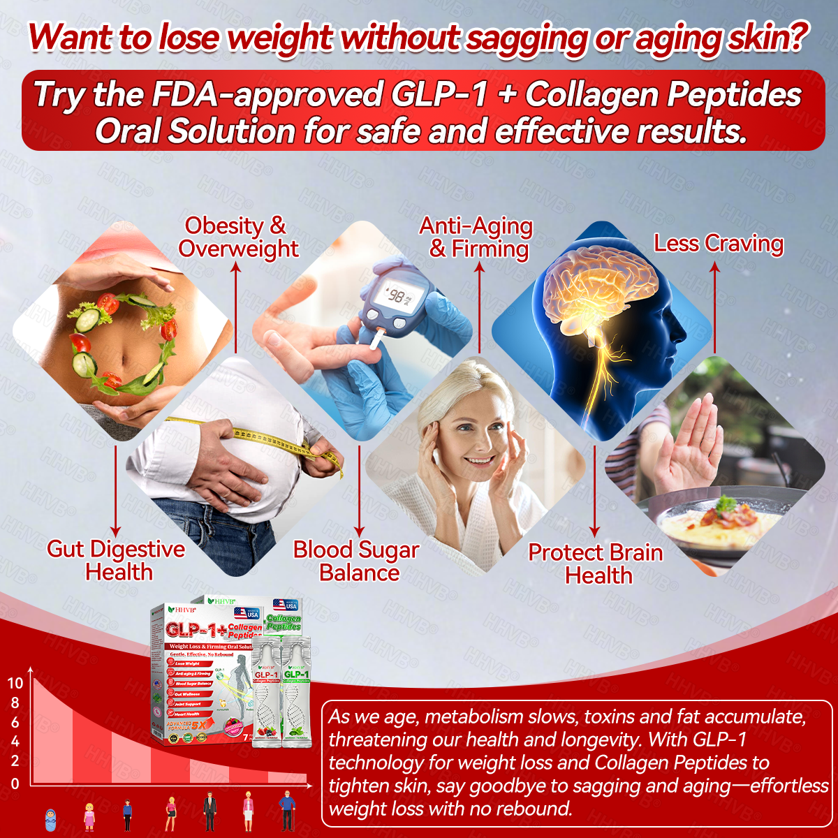 HHVBยฎGLP-1+Collagen Peptidesย Weight Loss&Firming Oral Solution Developed by an international team of metabolic and endocrinology experts, the GLP-1 + Collagen Peptides Oral Solution represents a groundbreaking synergy in weight management and skin regeneration.GLP-1 technology precisely targets the bodyโs metabolic center to regulate appetite, accelerate fat breakdown, and restore energy balance. Meanwhile, Collagen Peptides work deep within the dermis to repair structural loss caused by fat reduction, rebuilding the skinโs support network and visibly improving firmness and elasticity.Clinical studies demonstrate that this dual-action formula delivers measurable resultsโreducing body fat while enhancing skin tightness within a short period of use. It offers a scientifically validated solution for sustainable health, firmness, and long-lasting vitality.